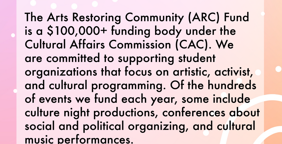 Does your org need funding? The purpose of ARC fund is to alleviate some of the fiscal responsibilities students orgs face when putting on cultural, artistic, activist-y programs (like cultural nights). Link in @culturalaffairs Instagram account.